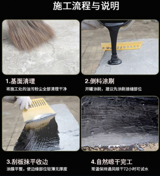 3. High adhesiveness: It maintains its adhesiveness over a long period of time, seamlessly bonding with the base layer to form a unified whole, providing superior waterproofing effect. It can be applied on damp base surfaces and used for leak repair, maintaining good adhesion with any foreign objects.